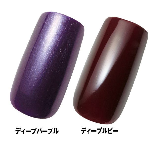 光沢のある鮮やか発色の有害物質フリーネイル。ディープルビーは優雅でセクシー、ディープグレーはクールな印象。