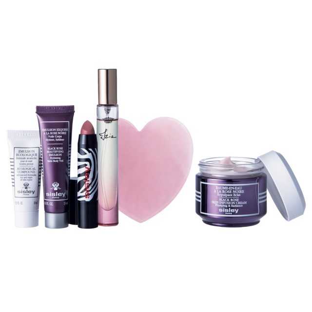 デイ&ナイトクリームの「ブラックローズ スキン クリーム」を購入。すると、顔用美容乳液(10ml)、ボディ用乳液(15ml)、ピンクベージュカラーのリップクレヨン(No.19)、フレグランス(6.5ml)の4種のミニサイズと、ハート形のキュートなかっさがセットに。