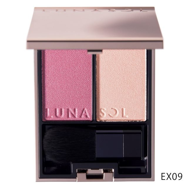 ブルーパールを潜ませ、血色を与えると同時に透明感も高める2色チーク。濡れツヤ感を与えるヌードカラーはハイライトにも。