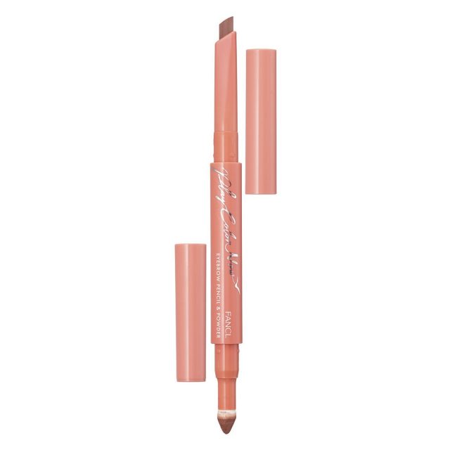 ほんのり赤みのあるブラウンで、柔らかな印象に。描きやすいなぎなた形のペンシルと、パウダーのダブル使いで、太め眉もシャープな眉も自由自在。