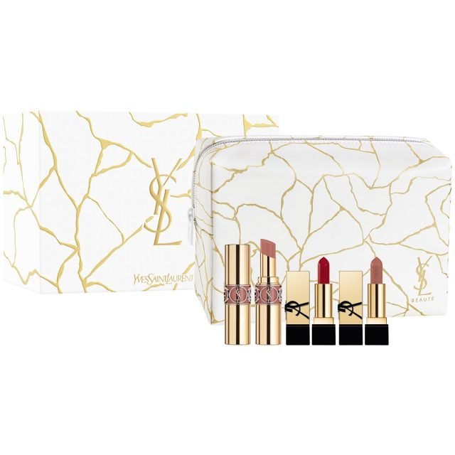 ブランドで絶大な人気を誇るリップ2種、計3本をセットにしたコフレが登場。美容オイルを65%配合したシアーな発色が魅力の「ルージュ ヴォリュプテ シャイン 150」はミルキーなヌードピーチカラー。また、サテンのツヤとピュアな発色が続く「ルージュ ピュールクチュール」は鮮烈なレッドとローズカラーの2色をイン。ホワイト×ゴールドマーブルのスタイリッシュなポーチに入れて、気分やファッションに合わせて唇を自由に彩って。