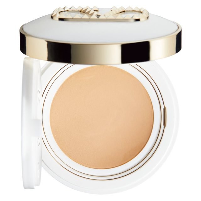 <9/8 一部店舗にて先行販売>メッシュテクノロジーの採用で、肌なじみの良さと高いカバー力を両立。内側から輝くような、美しいツヤ肌が一日中続く。「Vロゴをスタッズであしらったケースはメイク姿まで優美に」(PR 担当者)