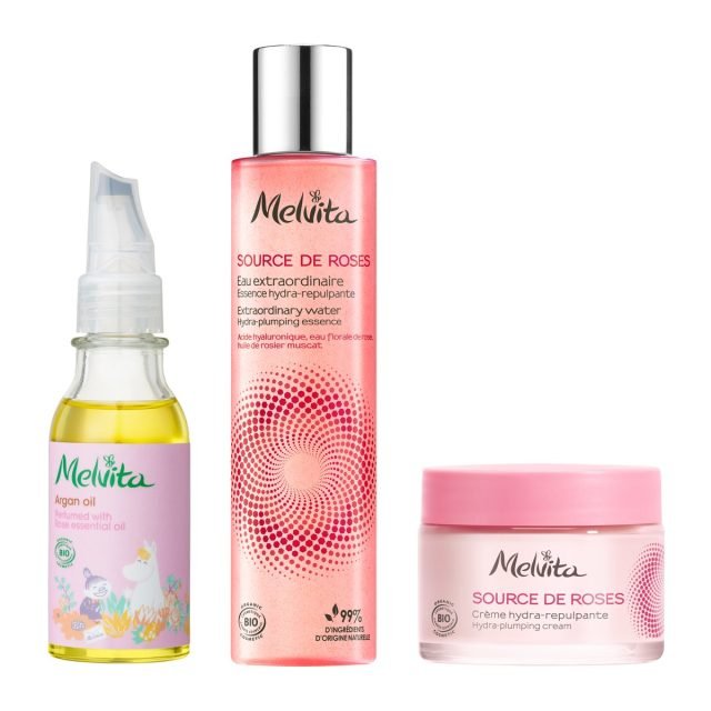 アルガンオイルにダマスクローズを配合したローズアルガンオイルは、使う度に心地良い華やかな香りとともに、潤いをギュッと抱え込むブースターの働きでモチモチ肌へと導きます。そんなローズアルガンオイルが、ムーミンのガールフレンドのスノークのおじょうさん&おなじみのミイが描かれたホリデー限定デザインに。さらに、ローズの力を詰め込んだ2023年9月発売の新感覚化粧水と人気のフェイスクリームもプラスされ、潤いに満ちたツヤ肌へと導きます。