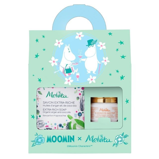 アルガンオイルやシアバターなど配合し、ナチュラルな香りと柔らかな泡立ちが特徴のオーガニックソープ。2023年2月、ブランド誕生40周年を記念し、美しい海の世界を表現した限定デザインとなったソープがホリデー限定コフレにイン。一緒にセットになったマルチバームは、3種類のハチミツと5種類のオイルで荒れた肌や唇などを優しく潤します。ムーミンパパとママが描かれたキュートなパッケージ入りです。