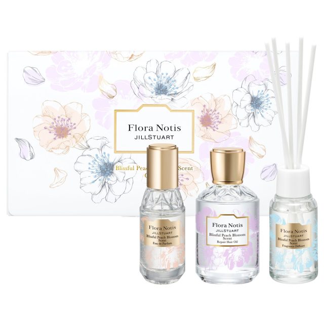 甘さ漂うピーチなどに弾けるようなピンクペッパーを加えたトップノートから、心浮き立つようなピーチブロッサムやローズなどの花々が満開となり、ラストノートは落ち着いたサンダルウッドが広がる限定の香り。その香りを堪能できるオードパルファンと、毛髪補修成分やUVカット成分を加えたリペアヘアオイルはレイヤードしても。さらに、部屋でも同じ香りを満喫できるディフューザーも一緒に花々が描かれたボックスに詰めてお届けします。