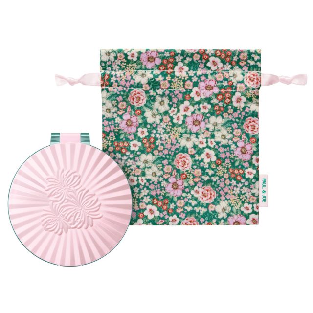 ポール & ジョーのシンボルモチーフ<クリザンテーム>(西洋菊の1種)を施したミラーが、ホリデーシーズン限定カラーでお目見え。上品なマットピンク×グリーンの組み合わせで、のぞき込む姿をもエレガントに演出。華やかなフラワープリントの巾着付き。