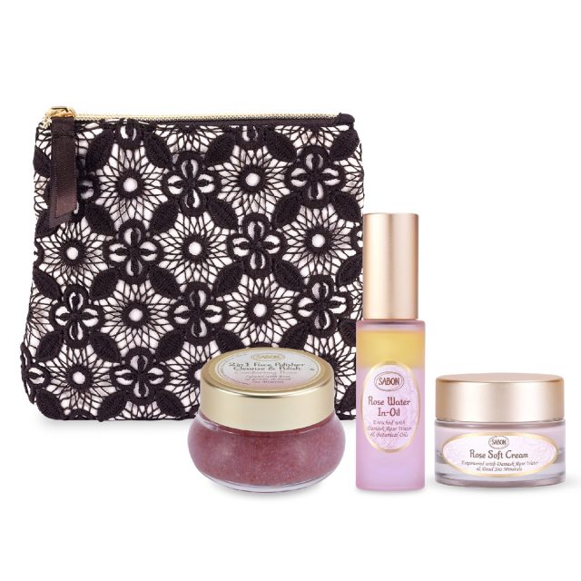 SABONを代表する人気のローズフェイシャルシリーズ。ブルガリア産オーガニックダマスクローズオイルを配合した2in1のスクラブ洗顔料、オーガニックダマスクローズウォーターとボタニカルオイルを配合した2層式ミスト化粧水、ローズの恵みを凝縮したベルベッティなクリームと、SABONこだわりのローズのフェイシャルケアを堪能できるセットです。フェミニンなレースポーチつき。