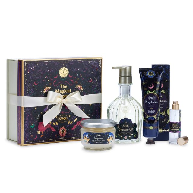 15周年のスペシャルキット。ドラゴンフルーツフラワー、ポインセチア、ムーンフラワーなどによるフルーティで華やかなホリデー限定フレグランス<スターライト・ブーケ>。この香りのバス&ボディケアアイテムとスノードームのセット。華やかな雪景色を連想させるスノードームの中にはSABONを象徴するバタフライが描かれた猫足のバスタブが。ボディスクラブやアロマ、ギフトボックスのミニチュアがおさめられ、ワクワクするシーズンの訪れを感じさせます。
