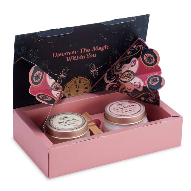 肌に優しくなめらかに磨き上げるスクラブと、みずみずしくなじんで潤いで満たすボディローションのギフトサイズをセットに。香りのレイヤリングを楽しめます。香りは人気のグリーン・ローズ、デリケート・ジャスミン、ホワイトティーの3種。蓋を開けるとバタフライが飛び立つ遊び心のあるポップアップボックスが、ホリデーのワクワク感を盛り上げます。