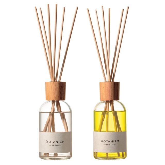 スキンケアから始まったライフスタイルブランド「ボタニズム」から、ふたつのリードディフューザーが誕生。右は、ユズやオレンジを感じる“シトラスドロップス”で、左は、草原の花々の中にハーブの香りを溶け込ませた“ハーバルブリーズ”。日々の疲れも和らぎそう。