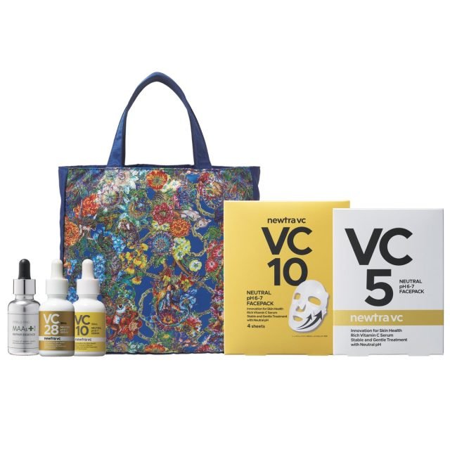 低刺激性の安定型中性ビタミンC誘導体配合の“newtravc”シリーズの濃度違いの2種の美容液(各30ml)、シートマスク(各4枚)に、肌質や季節問わず使いやすい美容液「MAAs リペアエッセンス」(30ml)の計5アイテムがセット。さらに現代美術家の鎌谷徹太郎氏の作品が描かれたバッグつき。