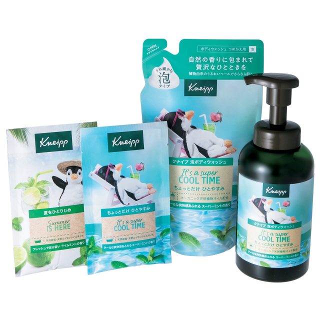 ミントの天然成分による、すがすがしさ満点の香り“スーパーミント”。その香りの泡ボディウォッシュ(450g)と詰め替え用(400g)、スーパーミント&ライムミントの香りの2種のバスソルト(各50g)のセット。スーッとした清涼感で、1日の疲れを吹き飛ばしてくれそう。