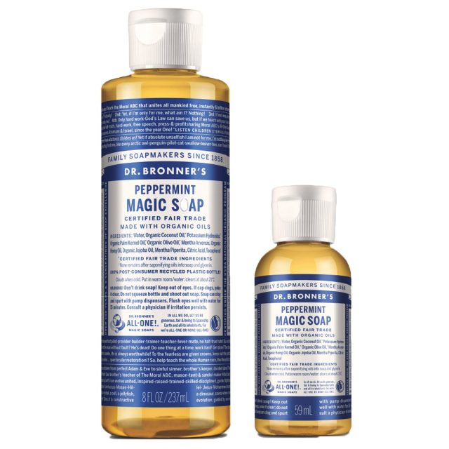 爽快感抜群のミントの香りのオーガニックソープ2本(237ml&59ml)をセット。香りだけでなく、オーガニックセイヨウハッカ油によるクールな洗い上がりも楽しめる。顔や体にはもちろん、食器用洗剤や布製品の洗濯などにも使えるので、夏キャンプなどで大活躍間違いなし。
