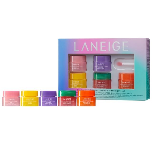 寝ている間に角質に潤いを与え、なめらかでふっくらとした唇へと導くリップマスク5種がミニサイズになってスペシャルボックスにイン。日本定番フレーバーの、フレッシュなベリー(ベリー)、甘いぶどう(グミベア)のほか、限定フレーバーの、ジューシーな完熟マンゴー(マンゴー)、みずみずしいスイカ味のアイスキャンディ(ウォーターメロン)、桃が香るアイスティー(ピーチアイスティー)をアソート。気分によって使い分けるもよし。友人とシェアするのもおすすめです。