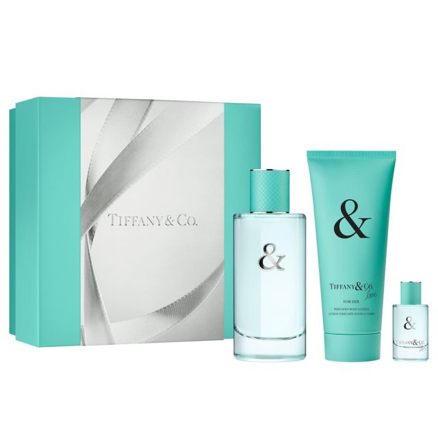 <多様な愛の形>を表現したフレグランス「ティファニー & ラブ フォーハー」のオードパルファムの現品とミニサイズ、同じ香りのボディローションのミニサイズをアイコニックなブルーボックスにセット。「ティファニー(TIFFANY & CO.)」のために開発されたボタニカルなブルーバジルやグレープフルーツ、ネローリ、ブルーセコイヤなどが組み合わさったフローラルウッディの香りです。