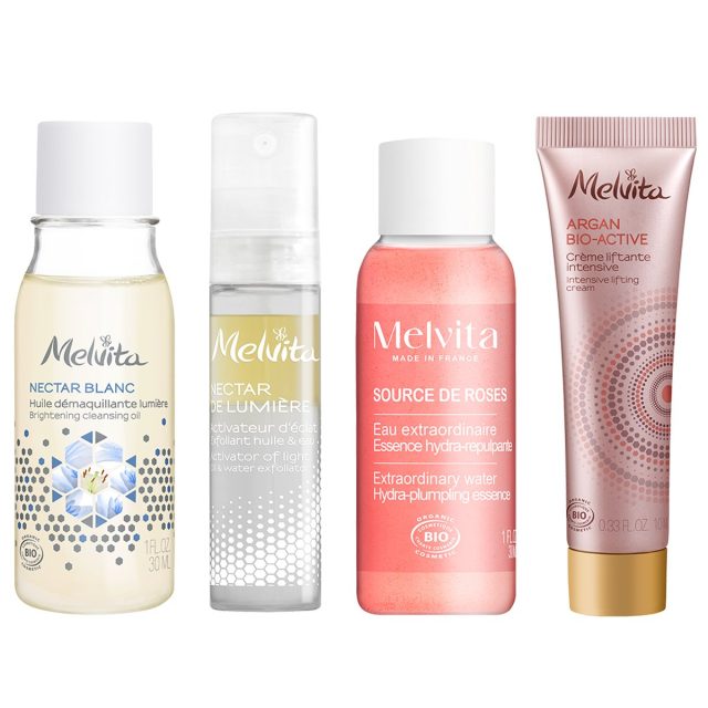 「メルヴィータ(Melvita)」のベストセラーアイテムが集結!古い角質や毛穴汚れなどの<肌にごり>を絡めて落とすクレンジングオイル、天然由来のAHAとPHAを配合した角質ケアブースター、潤ったふっくら肌に導くフレッシュなバラの香りの化粧水、シャープに引き締まった肌印象へと導くエイジングケアクリームと、このコフレがあればスキンケアが完結。ブランドビギナーにはもちろん、トラベル用としても重宝しそう。