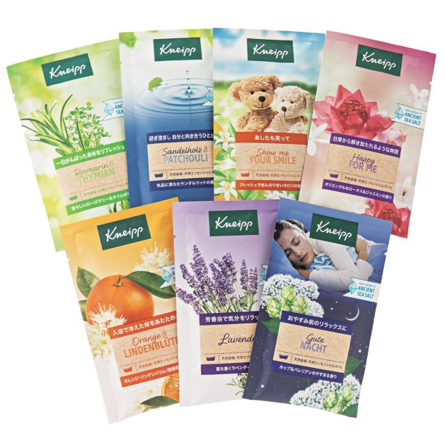 ラベンダーやネロリ、サンダルウッドなど、クナイプの「バスソルト」の中で人気の7種の香り(各50g)がセットに。ミネラル豊富な天然岩塩が配合され、入浴効果で体の芯までポカポカに。エッセンシャルオイルの豊かな香りが、1日の疲れを吹き飛ばしてくれる。