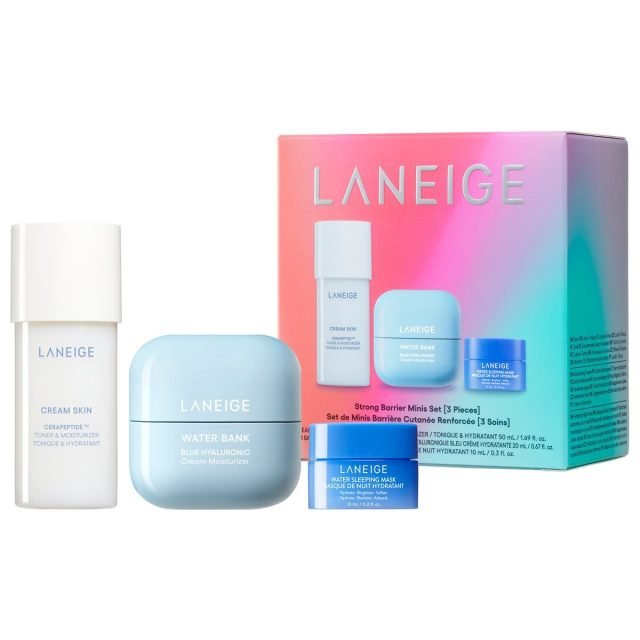 「ラネージュ(LANEIGE)」の人気スキンケア3種が入った、<潤いバリア>強化セット。クリーム1本分をまるごと溶け込ませた高保湿化粧水「クリームスキンローション」、潤いバリアを強化してなめらかでふっくらした肌に導くクリーム「ウォーターバンク モイスチャークリーム」、塗って寝るだけで乾燥ぐすみをケアするジェルテクスチャーのクリーム「ウォータースリーピングマスク」のセットで、冬の乾燥や肌トラブルに負けない肌へと導きます。