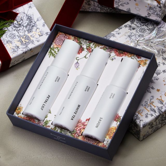 7種の植物成分と3種のヒアルロン酸を配合した、ベタつかないテクスチャーのパフュームハンドクリーム「ハンドセラム」のコフレが登場。グリーン系からリリー、フリージア、アンバーへと続く(ペタルリリー)、シトラスレモン系からオーキッド、サンダルウッドへと続く(サボン)、グレープフルーツからローズ、バイオレット、ムスクへと続く(ホワイトティー)の香りを、冬の花をイメージしたオリジナルボックスにイン。角質層までしっかり浸透して潤いを閉じ込め、しっとりとした肌へと導きます。