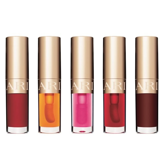 クラランスのスターアイテム「リップ コンフォート オイル」の、01(ハニー)、03(チェリー)、04(ピタヤ)、08(ストロベリー)、09(チョコレート)の5本(各1.4ml)セット。心地よい使用感のサラリとしたオイルで、“トリプルプラントカクテルN”が濃密な潤いで唇を包み込む。