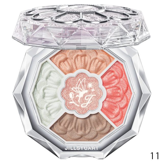 大小さまざまなパールを配合し、目元を宝石のようなきらめきで彩る5色をセット。11は愛らしいオレンジ系、12は可れんなパープルピンク系。