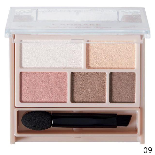 シャドウ、ライナー、アイブロウに使えるベージュブラウン系パレット。血色感を生む赤みピンク(左下)がアクセントに。