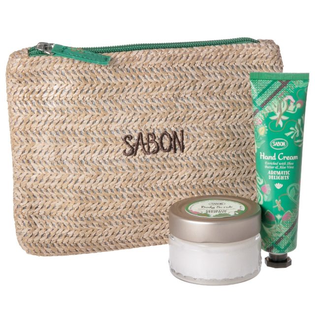 2月に限定発売されたばかりのフルーティ・アロマティックの香調“アロマティック・ディライト”のハンドクリーム(30ml・現品)とボディスクラブ(60g)、ポーチがセット。軽やかなテクスチャーのハンドクリームは、シアバターとアロエベラ葉汁が手肌に心地よい潤いを与える。