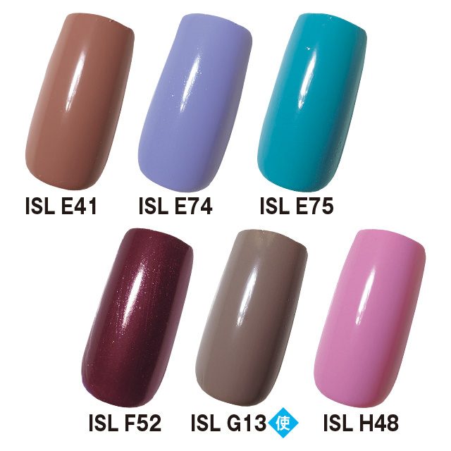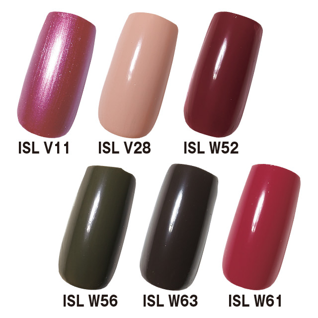速乾性に優れた高発色ネイルカラー。A16は鮮やかレッド、B86はポップピンク、N57はミルキーオレンジ、S63はパール入りのレッドブラウン。