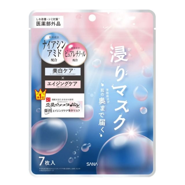 有効成分ナイアシンアミド、ピュアレチノールとエイジングケアに適した大豆「たまほまれ」使用の豆乳発酵液を配合し、1枚で美白・エイジングケアのWケアを実現。透明感のあるハリ肌を叶えます。じゅわ~っと液が出てくる柔らかい3層構造のシートで、お肌にエッセンスをしっかり届けます。
