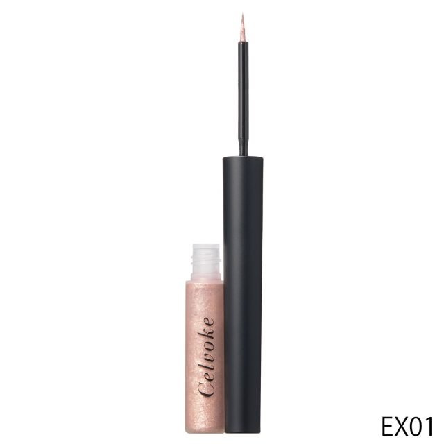 高輝度ラメ配合の極細ライナー。偏光ピンクとゴールドラメ入りのクリアなEX01と、シルバーラメが主張するビターブラウンのEX02。
