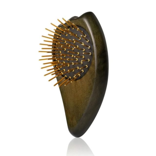 頭皮・髪だけでなく、首・肩・背中にまで使える多機能設計で、24K金メッキピン×拳型凸部による血行と巡りケアが可能。敏感肌にも対応した素材構成と職人技による重厚感のあるデザインが特徴のヘア&ボディ用カッサブラシです。