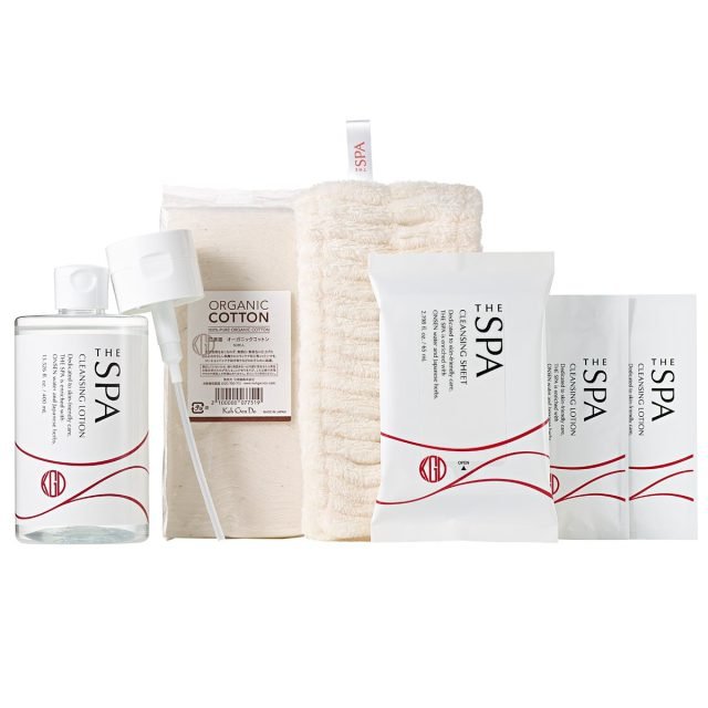 鹿児島県・垂水の澄みきった温泉水をたっぷりと使った<THE SPA>シリーズのコフレ。ウォータープルーフのメイクから毛穴、皮脂汚れ、角質、くすみまでケアする洗い流し不要のクレンジングローションの400mlと1回分のパウチ、同クレンジングローションを100%天然由来繊維のシートに含ませたクレンジングシートの現品に加え、優しい肌ざわりのスキンケア用オーガニックコットン、ふんわり柔らかな手触りのヘアターバン、<THE SPA>のロゴ入りバッグをセットに。クレンジングローションは、温泉水を含む潤い成分をたっぷり配合したとろみのあるリッチなテクスチャーながら、ベタつきのない使用感も◎。