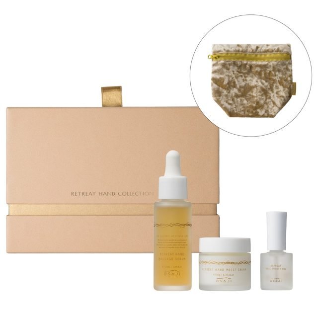 人気のハンドケアシリーズ「リトリート」が、ホリデー限定のお得なキットで登場。乾燥ダメージをケアし、集中ケアできるハンド美容液と、手肌を極薄ベールで包み込み潤いを閉じ込めるハンドクリームの現品サイズが限定パッケージに。さらに、爪を保湿しながらツヤを与えるネイルオイルを加え、3ステップで美しい手肌へと導きます。なめらかな手触りのベロアポーチつき。取り扱い店舗限定。