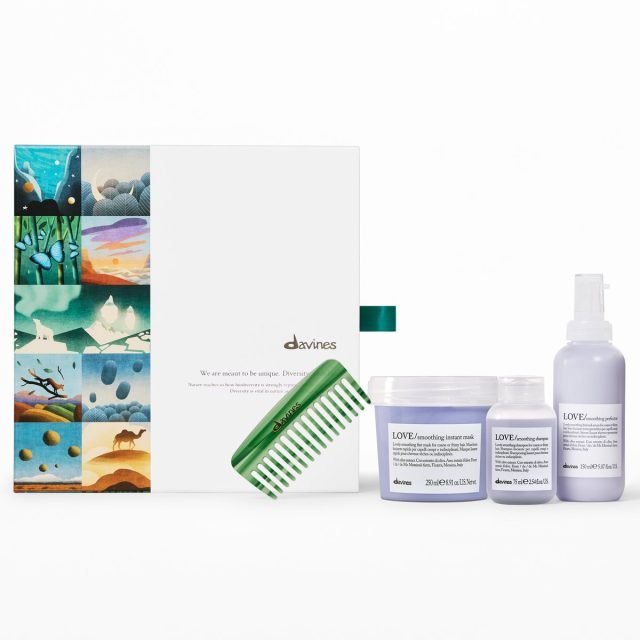 湿気による髪のうねりや広がりなどにアプローチする「ラブ」シリーズがコフレに。シャンプー後に髪にもみ込み30秒置くだけで潤いをしっかり浸透させ、驚異のツヤとなめらかさを実現するヘアマスクと、ドライヤー前の濡れた髪になじませることで熱ダメージを防ぎ、しっとりまとまりのある髪に導くヘアミルクのそれぞれ現品に、高い保湿を誇るシャンプー、ヘアマスクの効果を引き出すコームをイン。すがすがしく柔らかな香りも◎。自然界の多様性を表現したボックスも要チェックです。