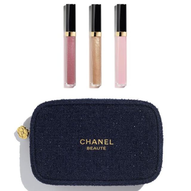 シャネルの人気リップグロス3色がセットに。119はピュアな発色のくすみがかったローズカラー、712は柔らかいキャラメルカラー、726はコントラストが強い青みピンク。さらに、使い勝手抜群のネイビーカラーのポーチをセット。煌めきと立体感が長時間キープされるグロスを主役にしたホリデーメイクを楽しんで。店舗限定発売。11月11日公式EC、一部店舗先行発売。©CHANEL