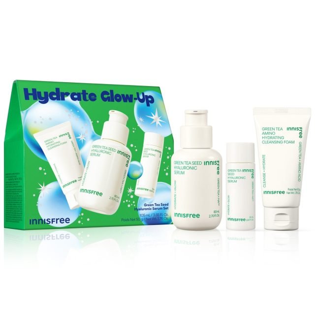 チェジュ島の自社農園で栽培された、美肌効果にすぐれた茶葉を使用した「グリーンティー」ラインから、サイズ違いの導入美容液+洗顔料のベストセラーアイテムがセットに。導入美容液にはカプセル化したヒアルロン酸も配合されていて、抜群の保湿力で潤いを抱え込んで逃さない肌へと導きます。洗顔料は肌の水分と油分のバランスを整え、すっきりとした洗い上がり。乾燥が気になる人や、イニスフリー製品を使ってみたいというビギナーにぴったりです。