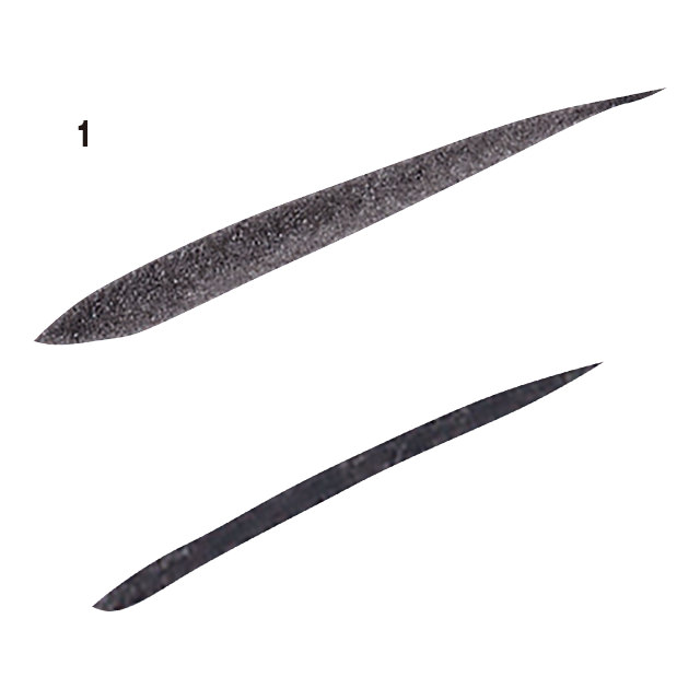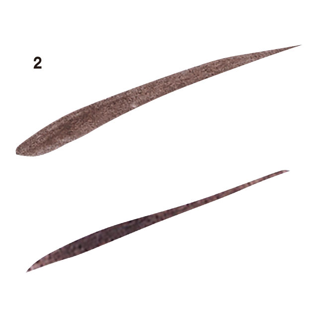 くっきりラインを描ける毛筆タイプと細部への描き込みがしやすいチップタイプのツインアプリケーター。1はブラック、2はブラウン。