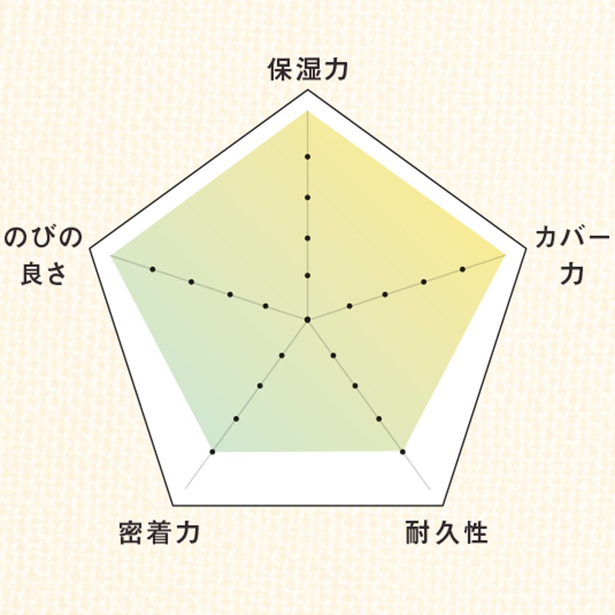 表情に追従するセラムキープジェルの中に、カバー素材と美容成分をイン。メッシュでこされた均一塗膜が肌の凹凸をつるんとカバーし、キメが整ったような光を放つ艶やかな肌を演出。汗や皮脂、乾燥にも強く、明るい肌印象が続く。