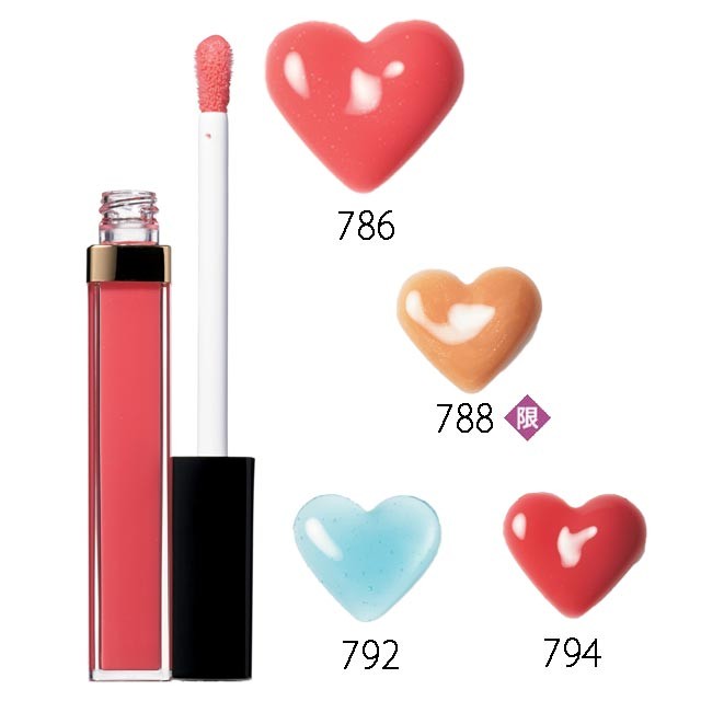 ベタつきのない心地よい使用感で唇にきらめきと立体感をプラス。786はかすかに輝くコーラルピンク。792は透明感のある水色。