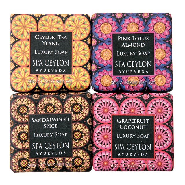 マンゴーバターや植物油などが潤いをプラスしながら優しく洗い上げる。ピンクロータスアーモンド、セイロンティー&イラン、グレープフルーツ&ココナッツ、サンダルウッドスパイスの4種。