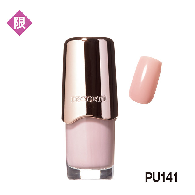 酸素透過性樹脂で爪に負担の少ない塗り心地。SP043はレッドやオレンジにきらめくホワイト、PU141はペール調のラベンダー。