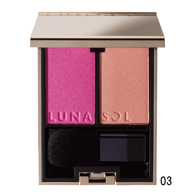 ニュアンス色や揺らめくパールの光効果で、血色感と立体感を自然に引き出す2色セットのチーク。03は青みピンクと艶やかなブラウン。