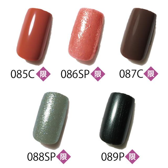 酸素透過性の良い成分が配合され、爪に優しい。084SPは大粒ラメが輝くメタリックゴールド、087Cはマットブラウン。