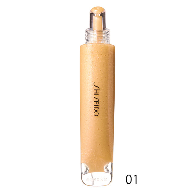 透明感のある発色で艶めくリップグロス。01はライトゴールド、02はヌードベージュ、09は青みパープル。シアバター配合で乾燥もケア。