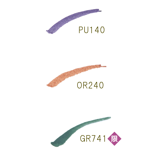 ひと塗りでしっかり発色し、にじみにくいのにお湯で簡単オフ。PU140はスタイリッシュなパープル、GR741は鮮やかなターコイズグリーン。