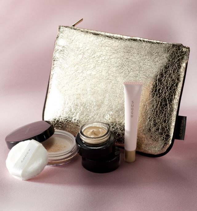 つけたて、肌なじみ後、皮脂分泌後と時間とともにツヤ感が変わる機能はそのままに、緑茶エキスやシルクプロテインを新配合し、肌との一体感がよりアップしたクリームファンデーションのハーフサイズがキットに。くずれを防いで血色感を高めるピオニーピンクの化粧下地、濡れたようなしっとりツヤ肌を作るフェースパウダーと一緒に使えば、究極の艶めきを肌に。キラキラゴールドのフラットポーチもお見逃しなく。