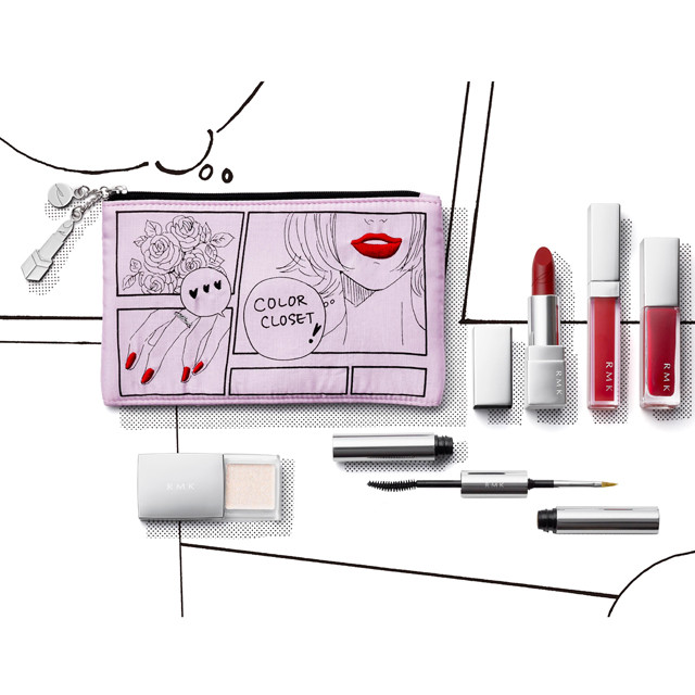 <レッド>をテーマカラーにした、色香漂うメイクアップコフレが登場。ドラマティックなレッドのルージュをはじめ、重ねづけを楽しめるグロス、ゴールドパールを宿したアイライナー×濃厚ブラックのマスカラ、多色パールの入ったルミナスジェル(ハイライター)、濃密レッドのネイルがセットに。漫画家・桜沢エリカ氏とコラボした、赤刺繍の施されたアメコミ風のポーチもキュート♡