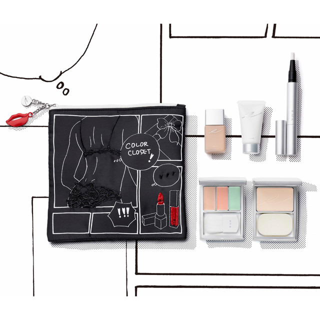 冬の澄んだ空気に映える、透明感たっぷりの肌に仕上げるベースメイクキットが登場。光拡散効果の高い3種のパウダーを配合した下地で肌を整えたら、リキッドファンデーションで素肌の美しさを格上げして。さらに自然な血色感をかなえるベージュカラー×コントロールカラー2色をセットしたファンデーションと、ペンタイプのハイライター、シルクのようななめらかな肌に仕上げるフェースパウダーもセットに。漫画家・桜沢エリカ氏とコラボした、立体感のある黒刺繍の施されたのポーチもロマンチック♡