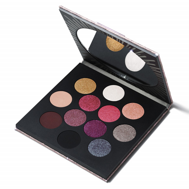 星座をイメージした12色のアイシャドウをパレットにイン。マット、フロスト、ラスターの3質感に、鮮やかなレッドピンクや優美なピーチヌード、クールなブルーグリーン、目元を引き締めるマットブラックなど、充実したカラーバリエーションは、オンオフともに大活躍間違いなし。さまざまな組み合わせでアイメイクの幅を広げて。