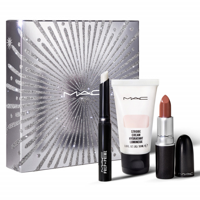唇のシワをなめらかに整え、リップカラーのもちをよくするリップベースと、保護成分を配合したリップスティックのピーチブラウンカラーの現品。さらに、保湿効果を発揮しながら明るく艶やかな肌に仕上げるリキッドハイライターのミニサイズをプラス。美肌に整え、リップ映えするメイクを楽しんで。
